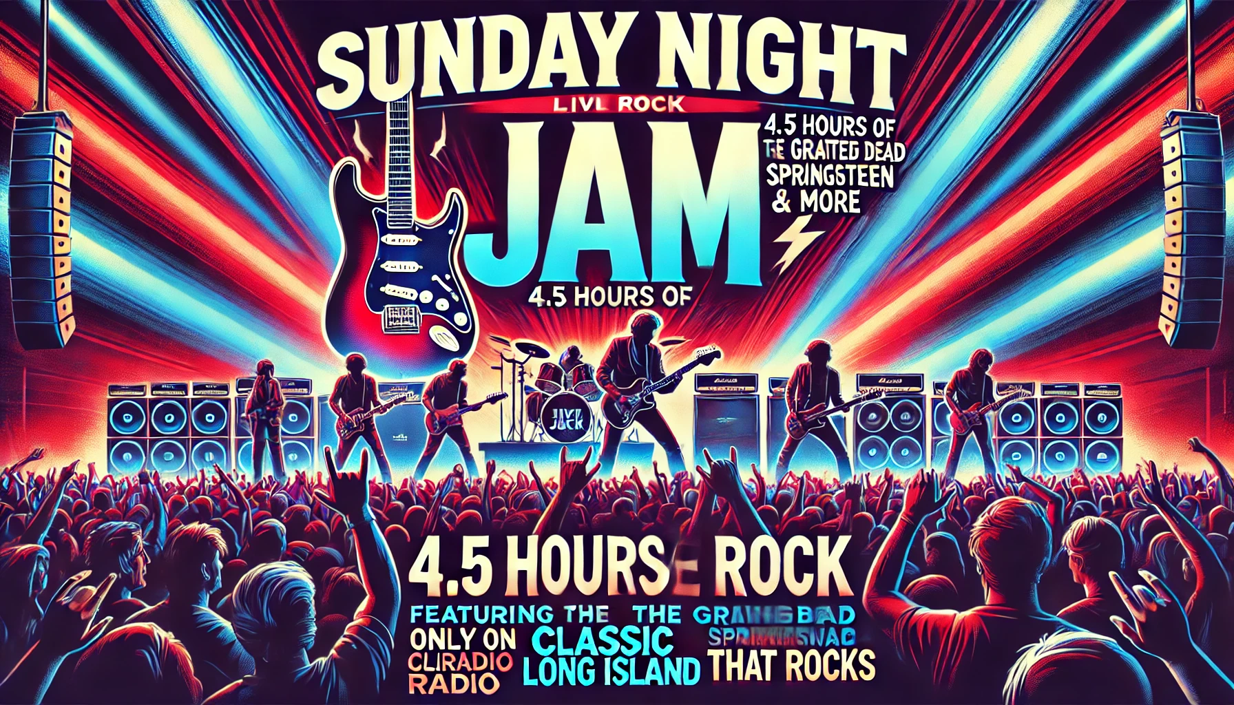 Sunday Night Jam is a 4.5-hour live rock experience featuring legendary performances from the Grateful Dead, Springsteen, and more. Sponsored by SwagWorld.com—custom swag that rocks. Featuring music from the 60's - 90's. Turn it up and enjoy!